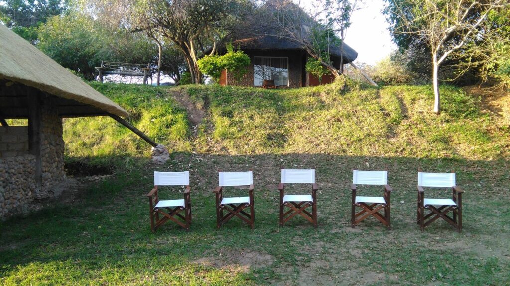 THATCHED CHALETS – Our lodge area comprises 7 thatched en suite chalets, with wooden decks , with thatch roofs to keep the midday heat out. Not All our chalets have a view of the Zambezi. Some have the most tranquil and beautiful rustic natural views and come with tea and coffee facilities and fans and air-conditioning. A chalet can accommodate 3 single beds comfortably or 4 at a squeeze.